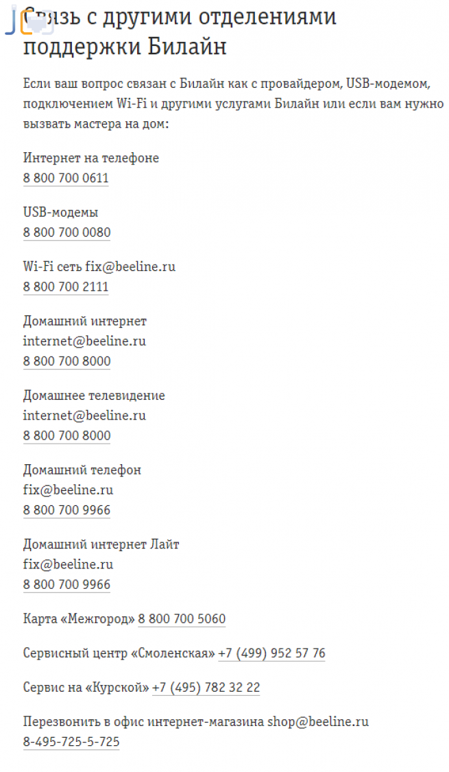 Существует несколько телефонных номеров провайдера, по которым рано или поздно абоненту придется звонить. Заказать поддержку удаленного офиса можно по бесплатной линии Билайн, телефон 8 (800) 770 79 63. Есть так же простой способ звонить оператору службы поддержки (как физическим, так и юридическим лицам) по короткому номеру 0611.