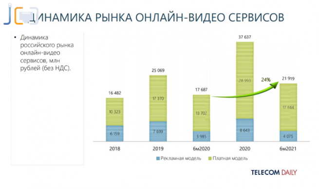 И до сих пор лидирует доля ПЛАТНЫХ подписок на онлайн-кинотеатры над теми, которыми можно пользоваться за просмотр рекламы. Для сравнения, выручка за подписки за полгода составила почти 18 млрд, а просмотры за рекламу принесли только около 5 млрд. В общей сумме доход онлайн-кинотеатров за полгода составил почти 22 млрд рублей и это на 24% больше, чем год назад.