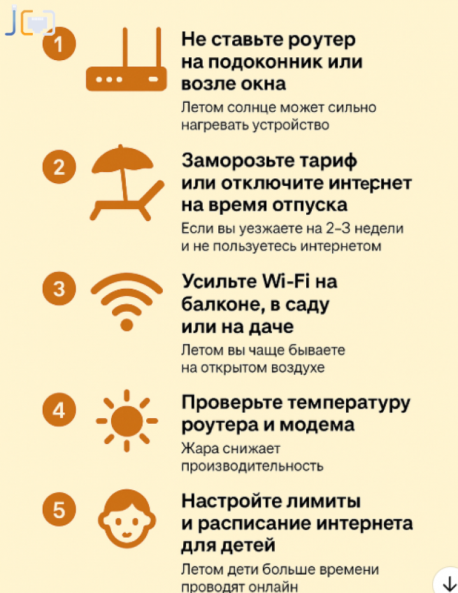 Летом душа и тело требуют природы, поэтому вы чаще бываете на открытом воздухе. Но это же не повод оставаться без интернета, правда. Стоит проанализировать локации, где вы чаще всего бываете летом и где не хватает скорости. Например, если хочется, чтобы связь добивала до балкона, для усиления сигнала стоит использовать Wi-Fi репитер или наружную антенну.
