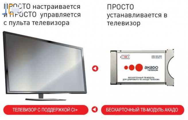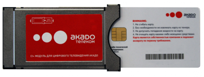 Ведь можно просто взять маленькую карту, размером с кредитку, и воткнуть ее в телевизор. И, вуаля! Более 40 телеканалов в отличном цифровом качестве будут развлекать вас по щелчку пульта. Так работает модуль Акадо для цифрового ТВ или правильнее его называть САМ-модуль. Причем не придется обрастать множеством пультов, которые вечно прячутся в труднодоступных местах, а понадобится всего лишь один – от телевизора. К САМ-модулю понадобится подключение услуги «Антенна Акадо» за 135 рублей в месяц. При желании можно подключить дополнительные пакеты тематических каналов.